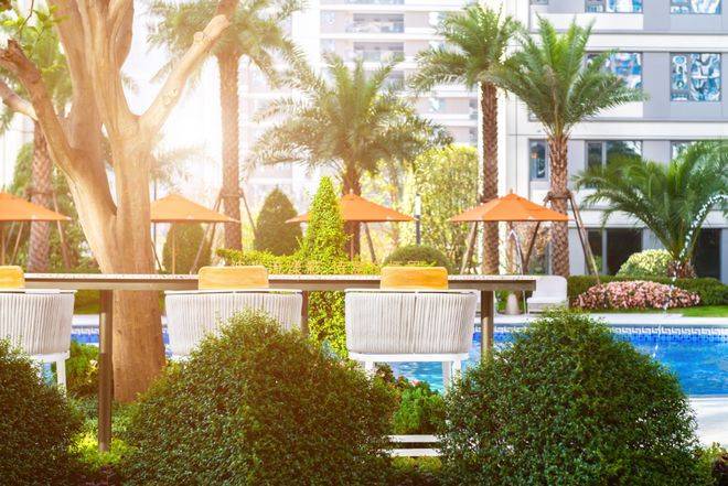 景观泳池边上,还做了景观艺术吧台。池的两侧,是“几何花园”、“馥郁花园”两座绿意盎然的“生态氧吧”。