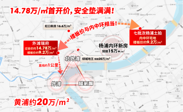 其次土拍层面:上海七批次土拍中,杨浦内中环宅地的楼板价已达约9.2万/㎡——这一价格,与外滩瑞府楼板价相当!