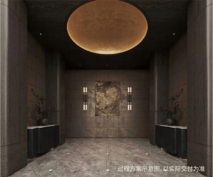 约50m面宽的气派门头+酒店式入户大堂,打造艺术格调归家。入户大堂由吴滨设计,呈现“天圆地方”的效果,方正的线条勾勒出空间的规整与大气,与顶部的圆形形成刚柔并济的视觉平衡,让每一次归家都成为一场尊贵的礼遇。