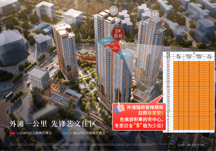 户型设计上,首开建面约121㎡户三房/约161㎡四房两个户型,主打舒适度与景观视野的平权。