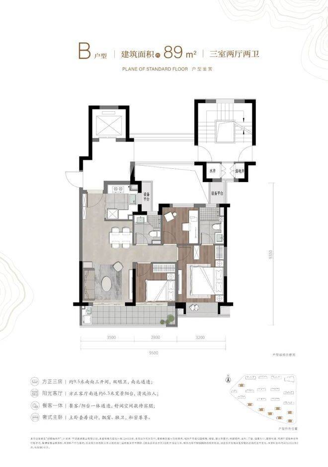 建面约89㎡的B户型,采用了动静分离设计,整体来看,该户型方正、紧凑,三房朝南搭配超大阳台,能有效避免中间套户型通风和采光效果不好的问题。而且主卧套房设计,带独立飘窗,兼顾私密性和舒适性。