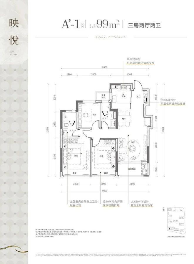 项目总建面约9万方,规划11幢12-16层纯高层,采用"南低北高"的错落布局,建筑限高50米,楼幢间距预计较为开阔,错落式布局,打造了两大主题园林空间。推出建面约99㎡与113㎡精致三居室,以及建面约108㎡、120㎡、128㎡、139㎡宽敞四居室,满足不同家庭需求。