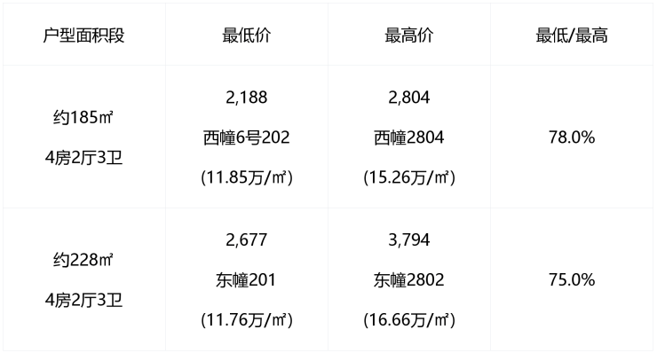 值得关注的是价格重叠现象:约有3套低区约228㎡房源的总价,与约20套中高区约185㎡房源重合。这为购房者提供了有趣的选择:是偏好更大面积与边套的私密感,还是更青睐中高区楼层的开阔视野与高度。
