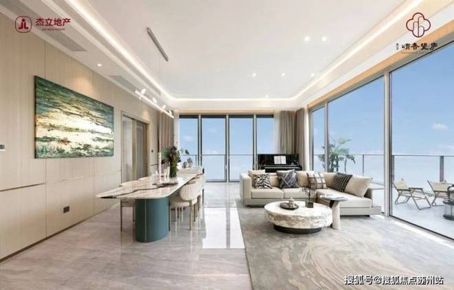 杭州杰立颂香望庐售楼处电话☎:400-8828-814(售楼处预约看房热线)最为极致的是上叠的餐客厅,双面落地玻璃围合,270°自然光如瀑布一般!并且,客厅与露台间还做了无门槛设计,让室内外的界限消弭于无。颂香望庐样板房实景-上叠餐客厅