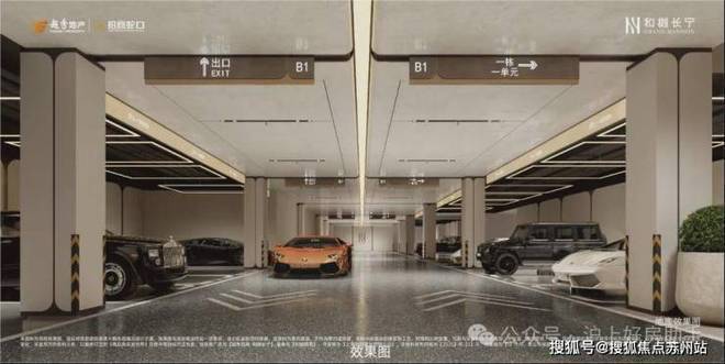 车行道地面采用水磨石、主体车道全吊顶设计,每个车位上方还都有LED环绕灯吊顶,营造仪式感归家氛围.