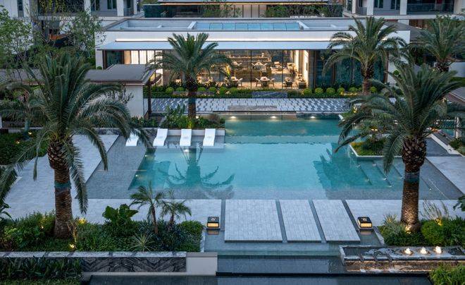 下楼入园。双水系热带景观园林已经实景呈现,加拿利海枣树在泳池边摇曳生姿。周末下午,孩子在浅水池边看鱼,你在林下的长椅上翻几页书,阳光透过树叶洒下斑驳光影。这不叫度假,这叫日常。
