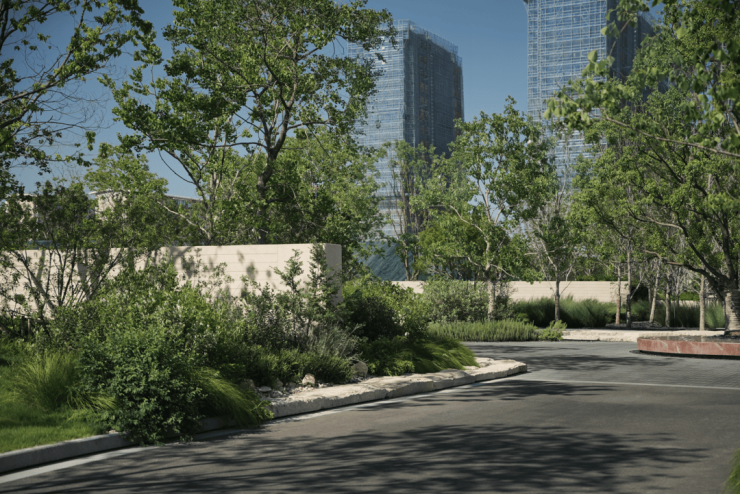 步入社区,首入眼帘的是约6米高水幕的下沉式山水庭院,与周围建筑融为一体,将自然与松弛感带给社区。
