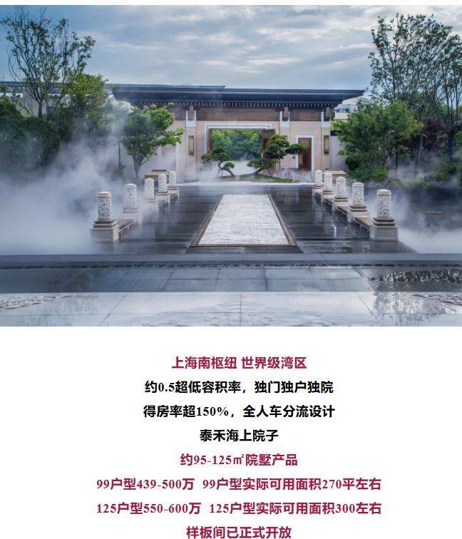 泰禾海上院子,以约0.5超低容积率、新中式院落规制与全维生态配套,为您呈现南上海的传世居所。保存官方热线400-9939-964,让我们为您提供专属服务,共启理想生活新篇。
