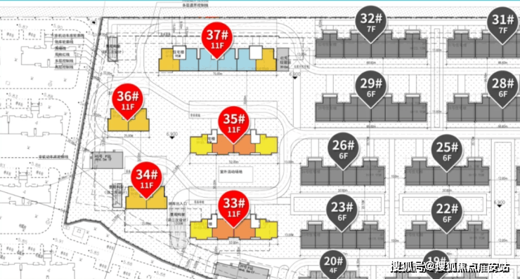 其中34#东边户靠近地下车库出入口,西边户靠近非机动车出入口,36#南向约13米是一个配电房,尤其是西边户是正对着的,37#北侧为绿化+河道,再往北就是东川路,东单元东边户紧挨着垃圾房;