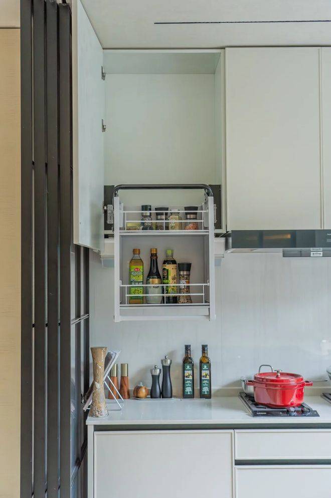 收纳系统是骊住的魔法五金:高柜里有旋转拉篮,再深的东西一转就出来;吊柜有升降拉篮,轻轻一拉,东西就送到手边,彻底不用踮脚爬高。