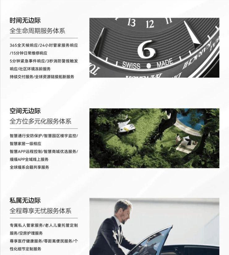 同源世界奢华酒店服务基因,缦合物业独创无边际生活服务体系,让社区在时光淬炼中冻龄如新,保障业主资产持续增值保值。以“至善无痕”为理念,从时间、空间、私属三个维度,共280余项标准化服务细则着手,打造自然无痕的服务内容。