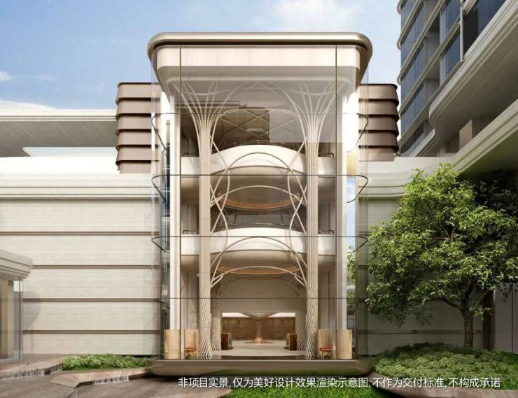 大门内外两重门厅景墙运用月光米黄石材近 1000 方,搭配香槟金金属线条,汲取爱马仕全球旗舰店的双曲面叠墙造景手法,在表达峡谷意向的同时,增加景墙奢华质感。