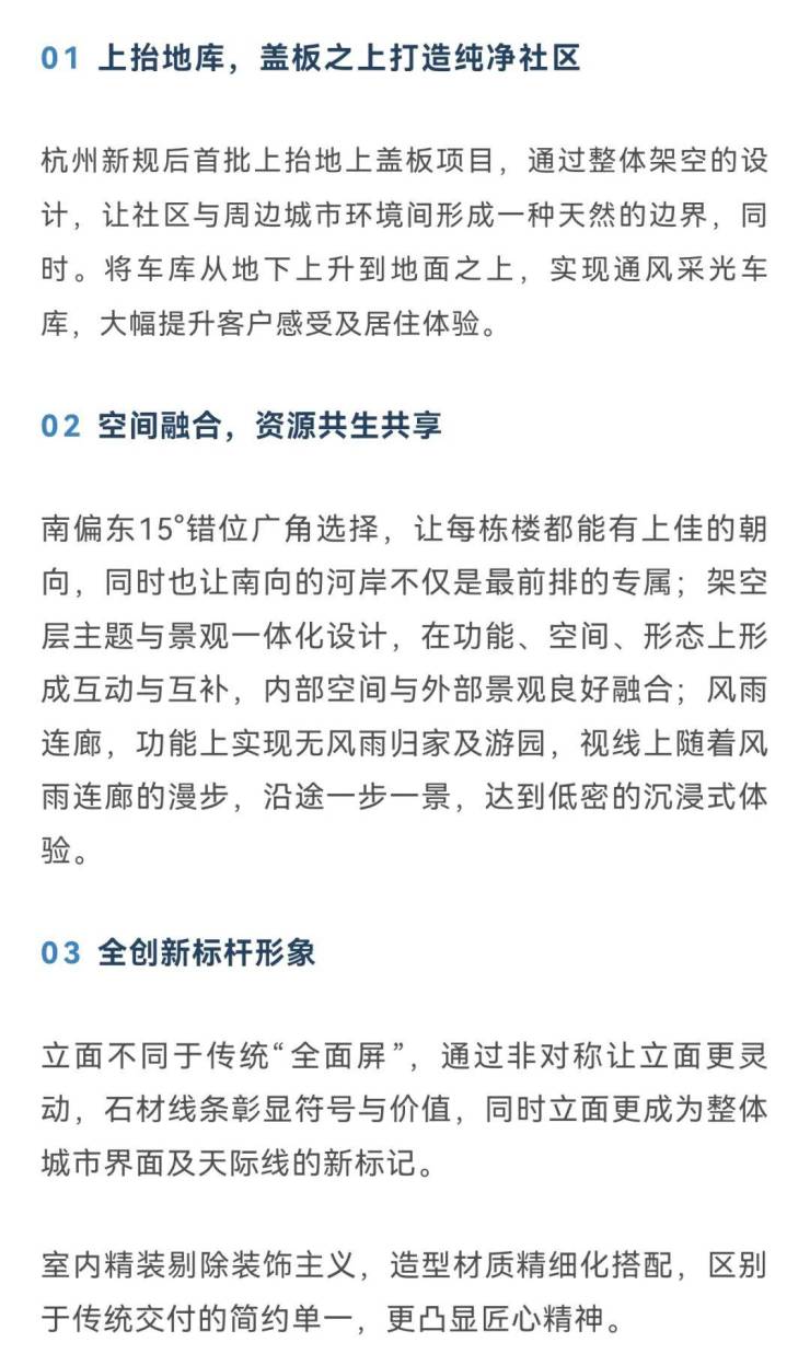 作为钱二新规1号作品,杭序府是杭州首批地库抬板项目,全部楼幢整体上抬,采取先进的“上盖模式”,整体社区向上抬高,整个社区犹如漂浮于大江之上的生机之岛。