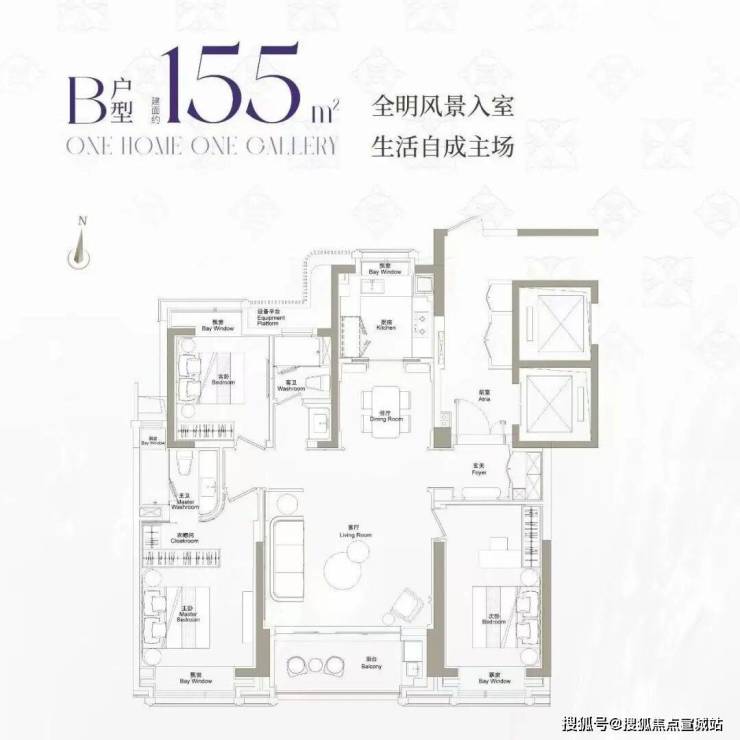 155平方米三房:三开间朝南,6米景观阳台,主卧套房面积25平方米,配独立衣帽间与卫浴。