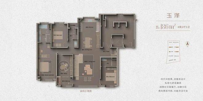 以建面约186㎡四房两厅三卫户型设计,朝南开间14.9米,客厅与卧室双联阳台设计约8米,采光优越,三卧朝南设计,南向双套房设计,南次卧外接封闭阳台。