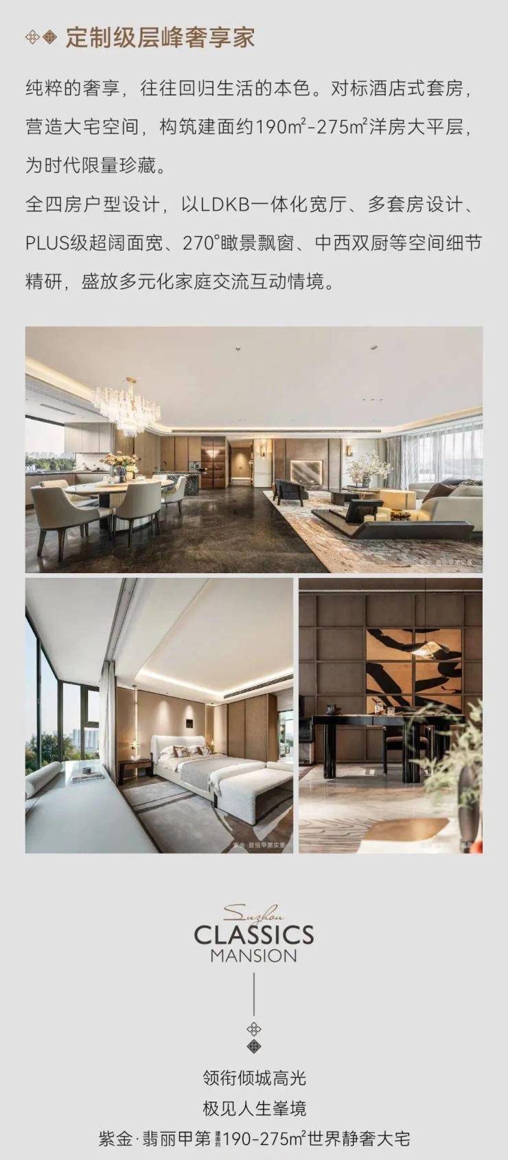 总体来说,紫金·翡丽甲第,全线大户型,四房、双套房全是标配!再加上项目本身具备的高品质装修标准,非常适合高端改善客户。要知道,该地块是苏州首个明确要求装标5000元/㎡以上项目,档次一定不会低。