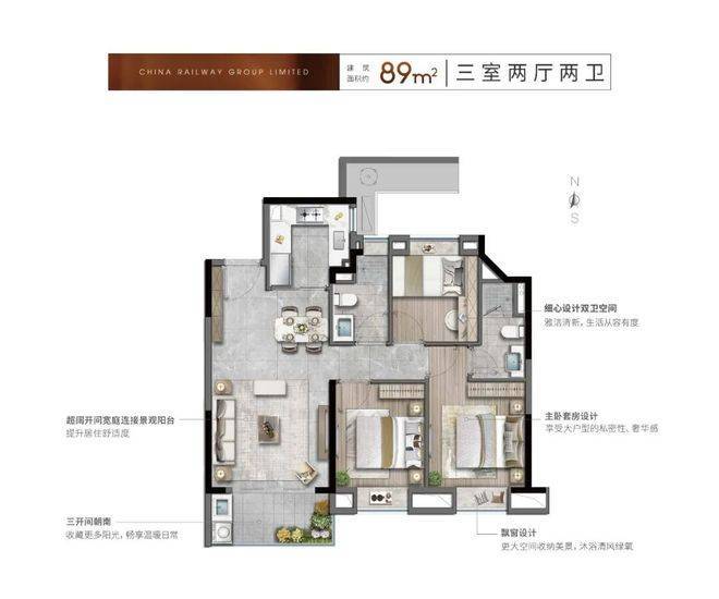 二是得房率高。它的得房率在78-79%,高于片区普遍的71-74%,这一优势直接转化为户型空间使用价值上。比如89㎡户型比竞品元启多了一个卫生间,99㎡的客厅面宽3.8米,主卧3.3米,129㎡则以“四开间朝南+大平层概念”迎合改善需求,也正因此规划和户型都给到高于平均水平的b+。