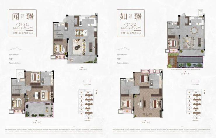 02、静美叠墅(主力改善) l小叠(168-188㎡)四房三厅三卫 ◦ 上叠168㎡:赠约13.5㎡星空露台,总价370-450万 ◦ 中/下叠188㎡:下叠赠约35㎡南花园,中叠赠15㎡北花园,总价400-480万 l大叠(205-236㎡)四房三厅三卫 ◦ 上叠205㎡:赠约22㎡阔景露台,总价450-520万 ◦ 中/下叠236㎡:赠约35㎡南花园/15㎡北花园,总价450-640万