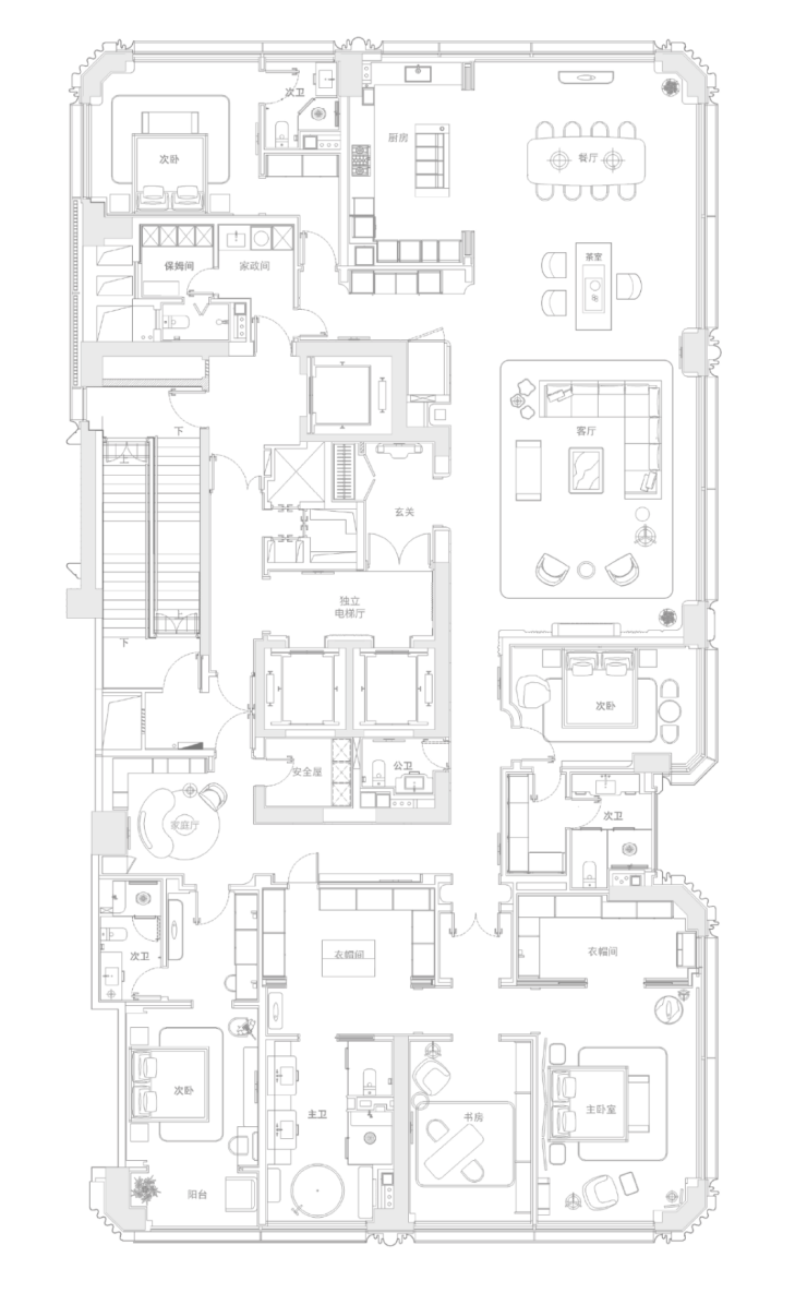 约600㎡户型是6房带4套房,完整满足了居住在平层的所有功能空间需求。