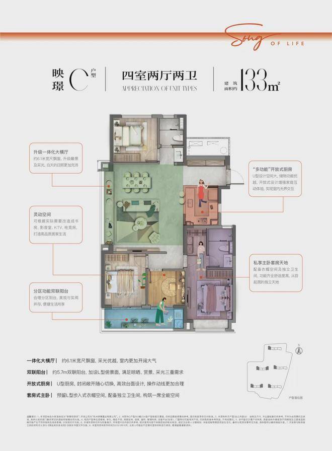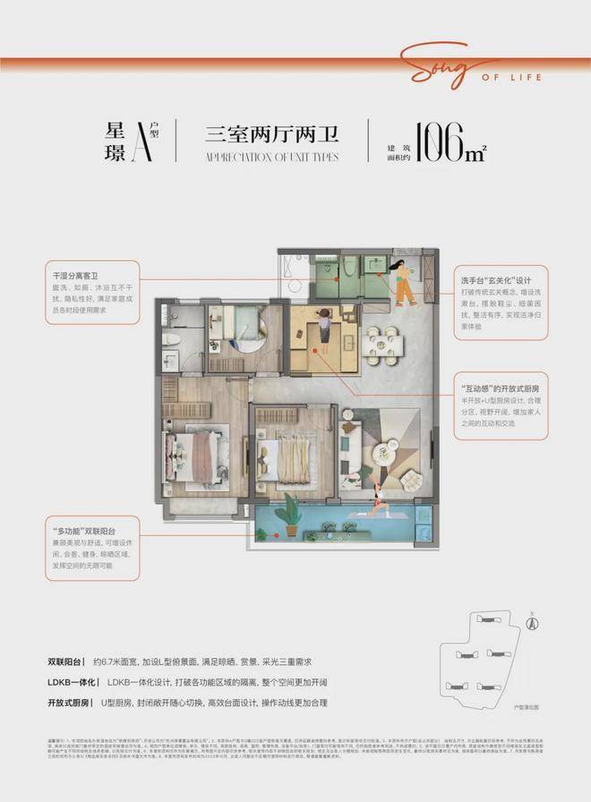 约106㎡户型点评:双联阳台约6.7米面宽,加设L型俯景面,满足晾晒、赏景、采光三重需求,LDKB一体化设计,打破各功能区域的隔离,整个空间更加开阔,开放式厨房 U型厨房,封闭敞开随心切换,高效台面设计,操作动线更加合理