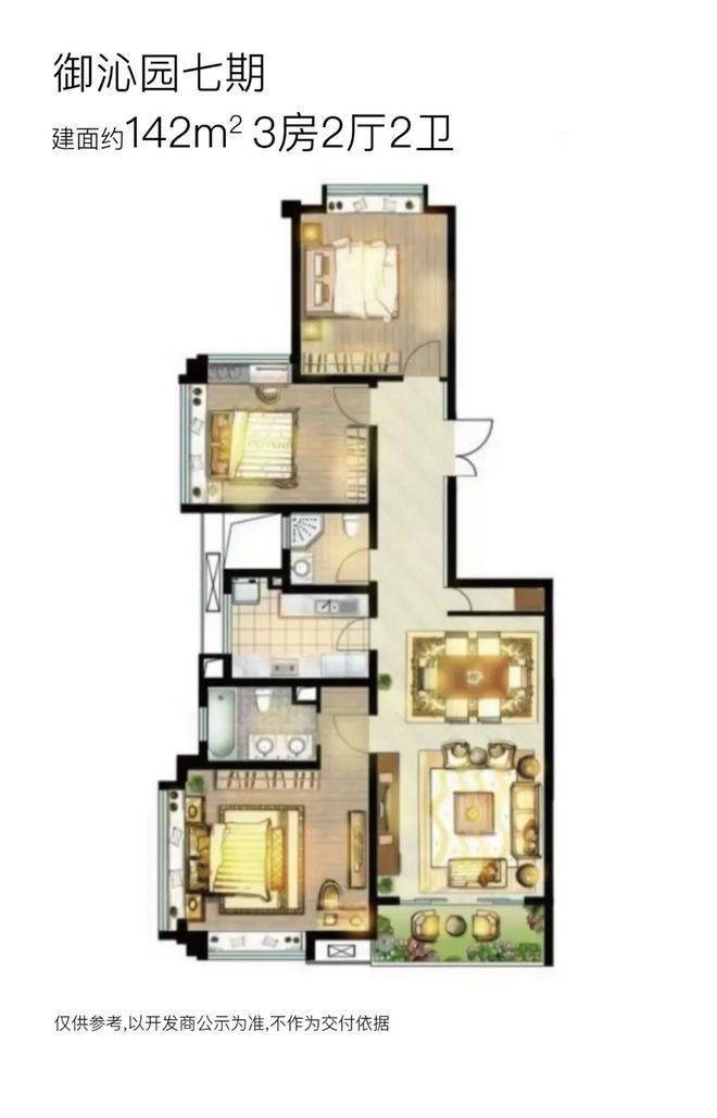 【御沁园】七期将推出3栋18F高层住宅,两梯两户无连廊设计;将推建面约132~172㎡三房户型,其中: