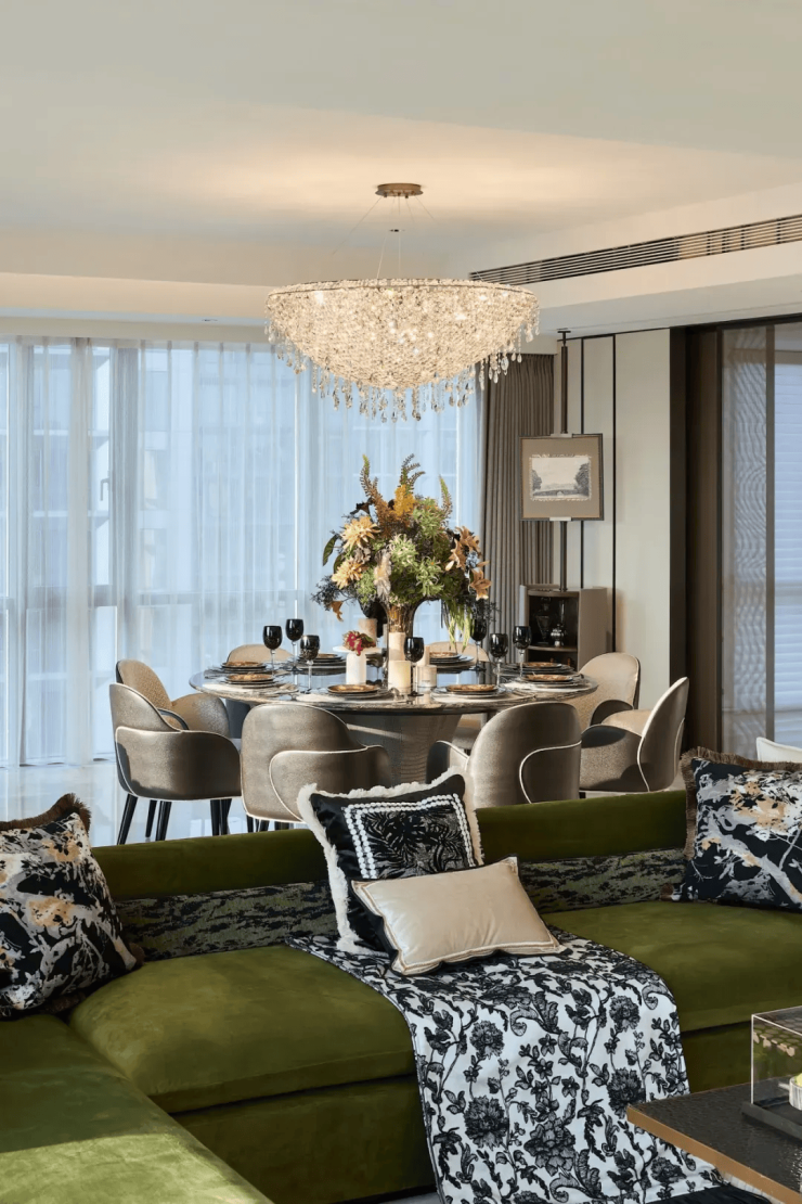 草绿色的沙发勾勒出大草原的意境,品牌茶几和玄关的桌子呼应。优雅的地毯勾勒出会客厅的核心区域,不同的座椅增加对话场景。海派的融合力量下,丰富的艺术元素巧妙衔接,丰富的细节彰显奢华。多元化的设计主题下,增加社交和品鉴的场景。