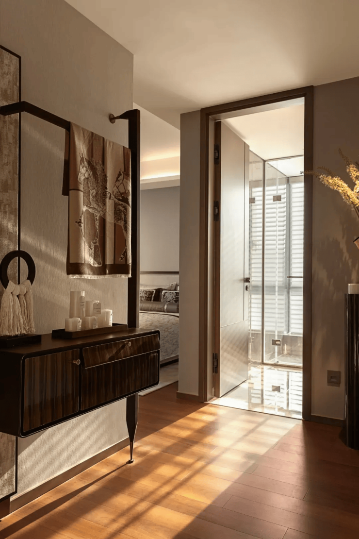 更出彩的还有邱德光团队打造的“潮印”300㎡样板空间,每户标配“门中劳斯劳斯”的意大利装甲入户门,约270°环幕的全景落地窗设计,再辅以近24米长的IMAX级客厅观景面,将眼前如缎面般铺开的之江核心区尽收眼底。