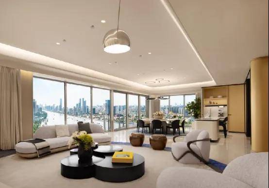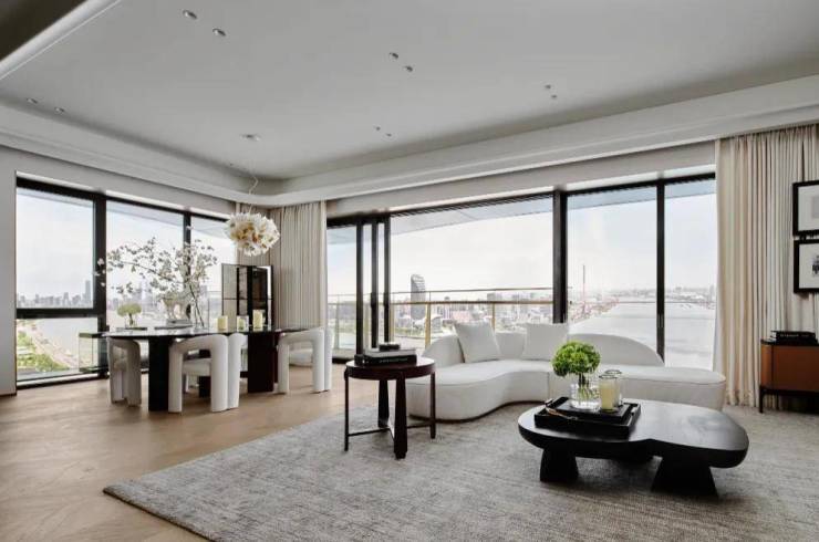 约9.65米超大客厅面宽,搭配蝶翼双阳台,西瞰陆家嘴摩天天际,东赏百年码头人文底蕴,北望黄浦江浩渺江景,环幕视野拉满;