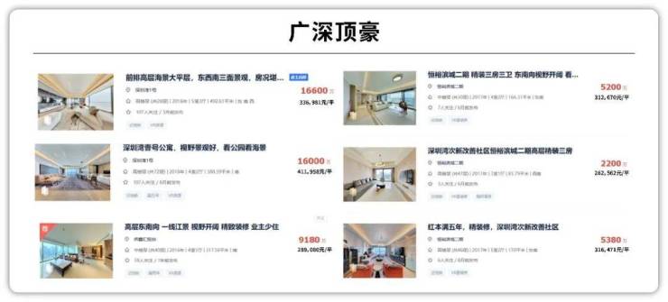 国内其他核心城市顶豪中,深圳湾一号前排无遮挡海景二手普遍30万+/㎡,恒裕滨城二期一线海景30万+/㎡,中信信悦湾顶复38万/㎡,广州侨鑫富悦台28万+/㎡;