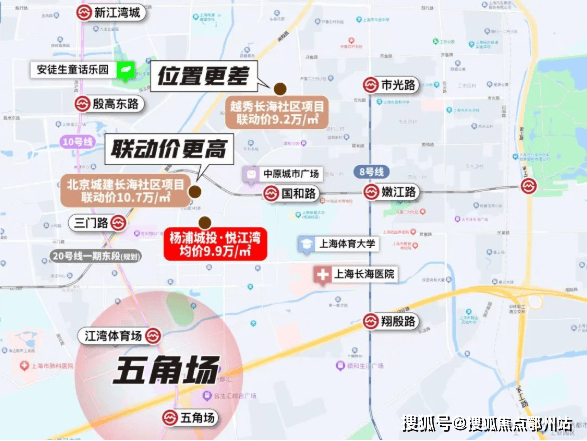 去年二批次土拍杨浦长海地块,联动价大涨!联动价突破了10W+,来到了10.7万/m²!比南侧400米的杨浦城投·悦江湾贵了8000元/㎡! 中环旁双轨交+新江湾+五角场的【杨浦城投·悦江湾】成最大赢家!