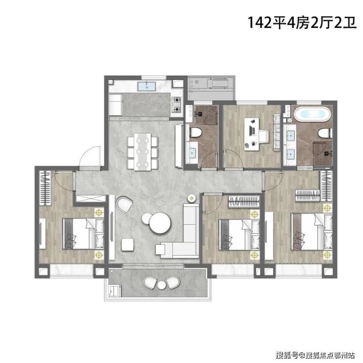建面约142㎡4室2厅2卫户型, 2梯2户设计 ,大大提升了入户 尊贵感和私密性 。