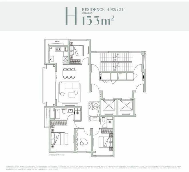 经典的四叶草布局,四开间分布在四角,兼顾私密与互动,是二胎家庭的优选。