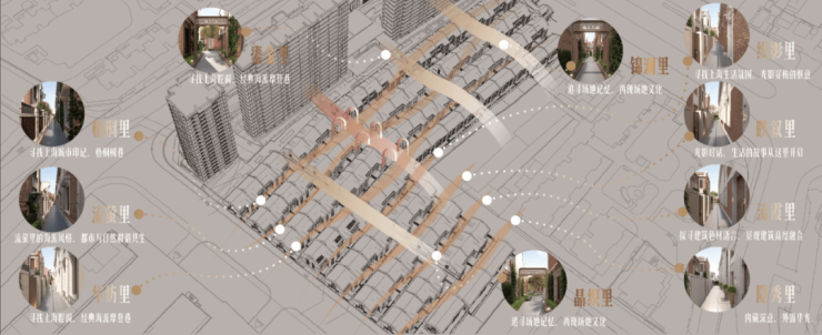 难得的是,项目以“摩登城市的里弄生活”为精神载体,通过对场地历史与上海城市记忆的深度转译,构建了一套独具海派风情的巷道命名体系。整体规划以“鱼骨状”布局为肌理,致敬传统里弄的烟火气与邻里感。