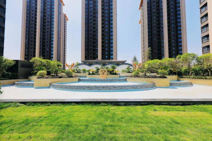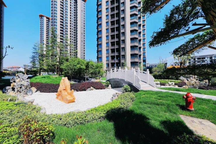 小区内部的新中式山水园林设计与城市绿化自然过渡,设置众多艺术雕塑、景观休闲步道、中央景观层叠式水瀑布、儿童游乐场等,形成浑然天成的园林景观。