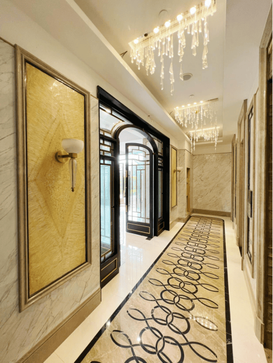 每栋楼也都是地上地下双入户大堂的设计,一层入户大堂地面采用了曼陀罗拼花造型,而且都是纯手工切割技术打造的定制款,造价颇高。
