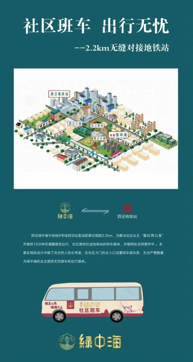 而绿中海与目前泗泾核心9号线泗泾站直线距离约1.9公里,可以公交接驳。并且项目配置社区班车往返地铁站。