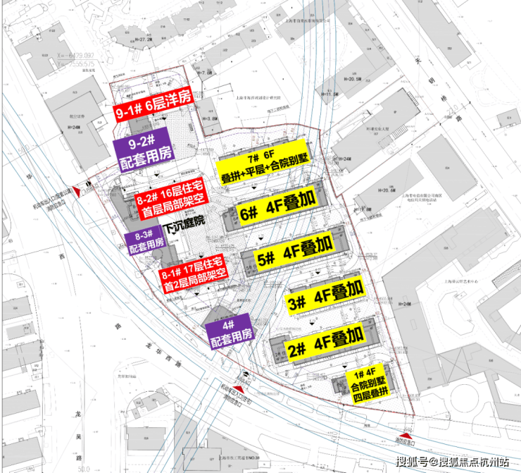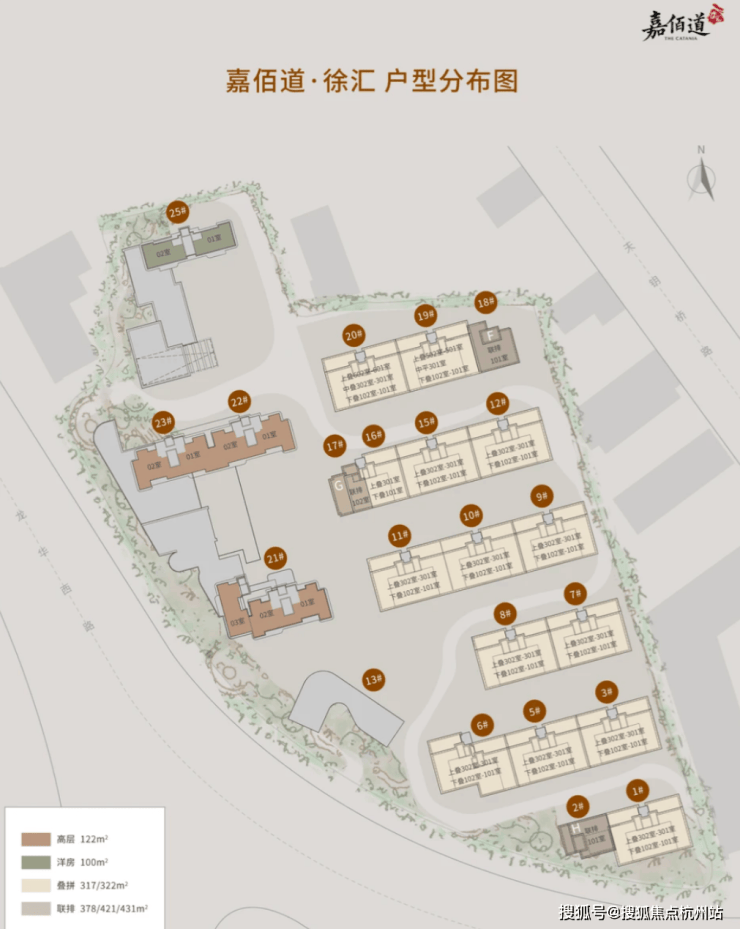 根据规划,项目采用高低配的组合,拟建2幢16-17层高层住宅,以及1幢6层洋房,6幢4-6层叠加产品,包含联排(合院),共计60套。