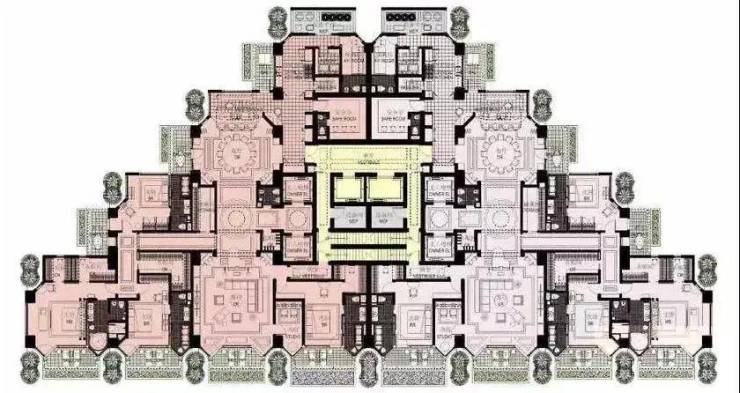外部设计已经足够令人震撼,内部户型更是壕到无法想象。独特的金字塔设计,仪式感超强。所有住宅单元都尽可能南向,拥有360°采光的同时不浪费一丝一毫的江景。