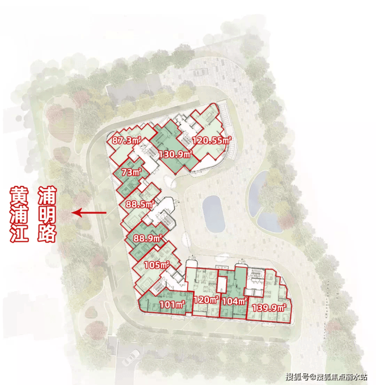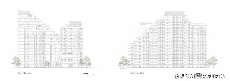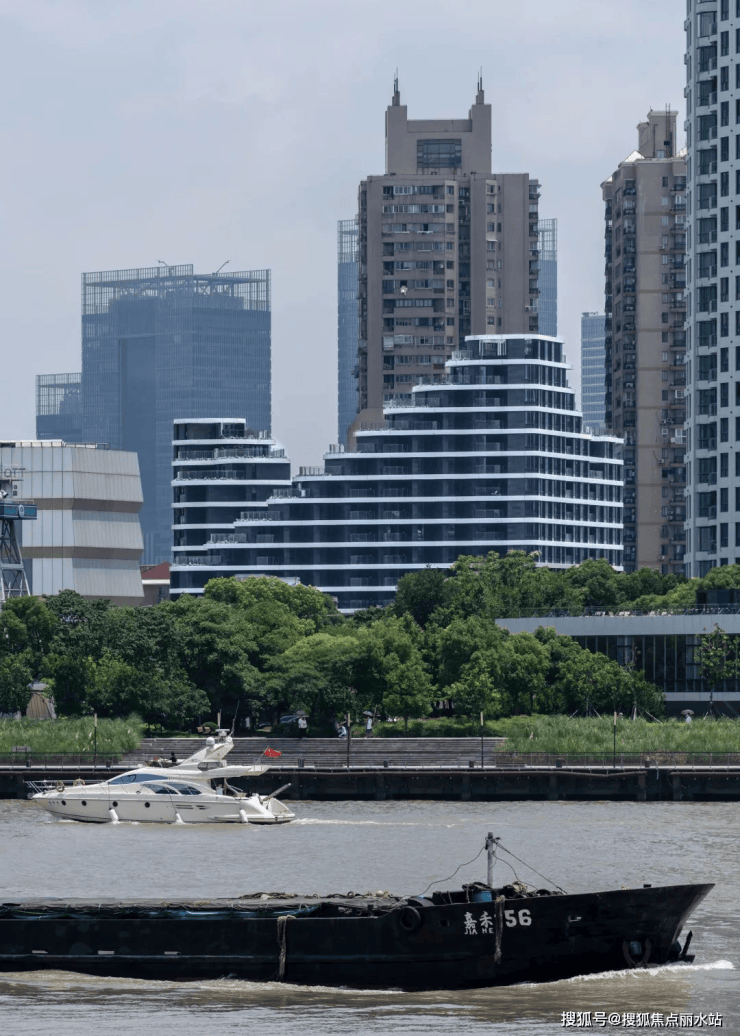 层间设置形态柔和的水平向飘带,与黄浦江流动的水体相呼应,勾勒建筑轮廓,串联立面转折、观景阳台等,消隐了传统住宅前后错动的复杂轮廓,强化建筑的整体性。