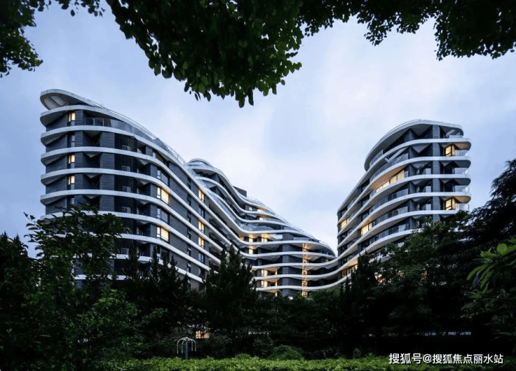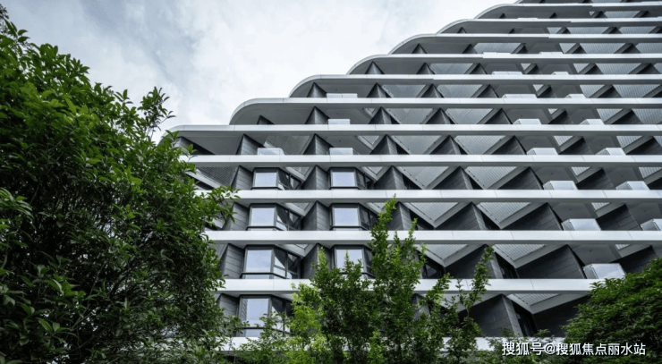 项目外立面采用玻璃幕墙现代简约风。建筑轮廓曲线蜿蜒,呈波浪线型层层迭高并后退,时尚感非常强。