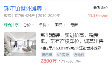 再来看看二手房,于2019-2020年建成的珠江铂世外滩届,在链家网上的参考均价是15.5万/㎡。此外,项目周边房龄20年左右的二手房,单价多在约11-12万/㎡。