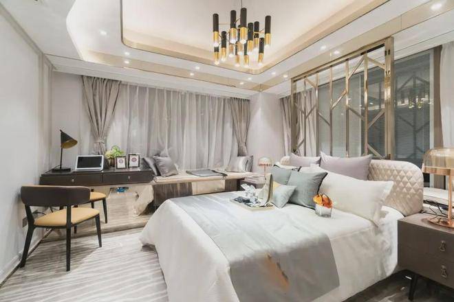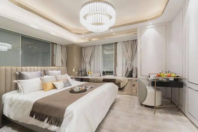 就是主卧,做了比较简单的床头背景墙,看起来没有那么单调,显得很有档次。搭配了一张双人大床,睡得很舒服。不过除了安装中央空调之外,其他都是贴了石膏线条,给人的感觉还是蛮不错的。