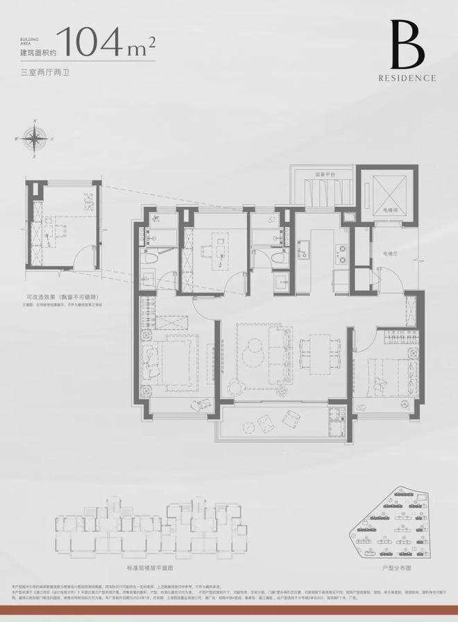 建面约104㎡3房2卫:
