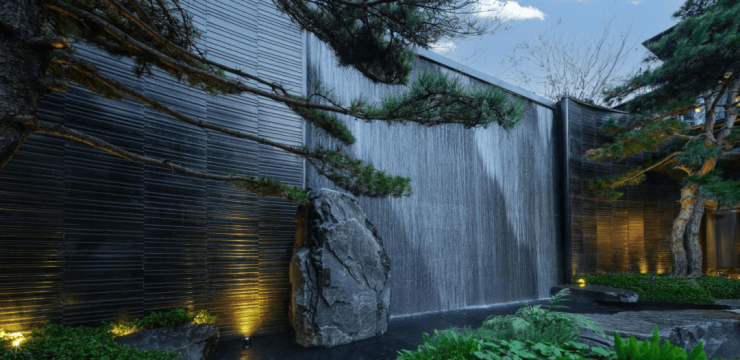 下沉庭院中,东方禅意的意境,融合了抽象化线条,在传统向现代衍生的进程中阐释一方悠远意境。场域复刻《万壑松风图》画面,沿步道拾阶而往,松壑、水境、景墙围合而成探幽境地,为游人提供更丰富的景观体验。古朴苍虬的黑松以俊逸姿态迎宾,创造出“水上青松”的超然脱尘的意境;层层叠叠的流水,将“静观波澜壮阔”的山水格局纳入其中,整个昭示面展现“明月松间照,清泉石上流”的山水人文意境。