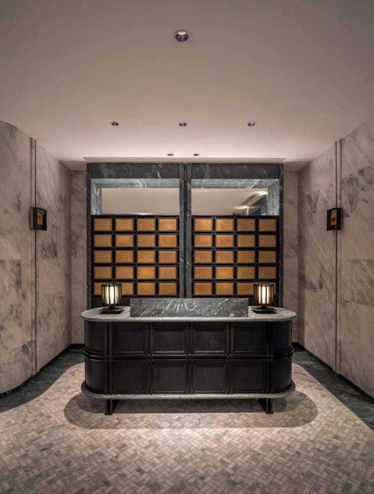 入户大堂挑高15米,采用和平饭店同款铜门,由20多位工匠耗时45天打造