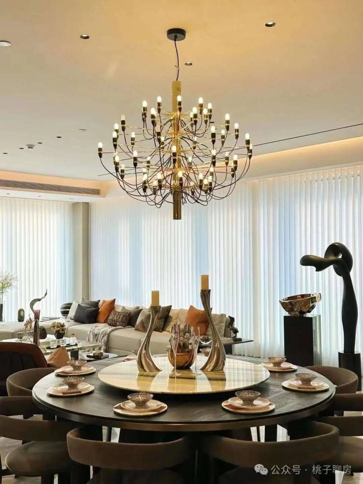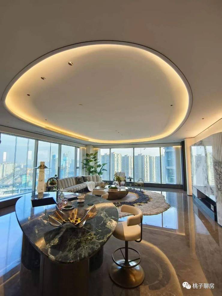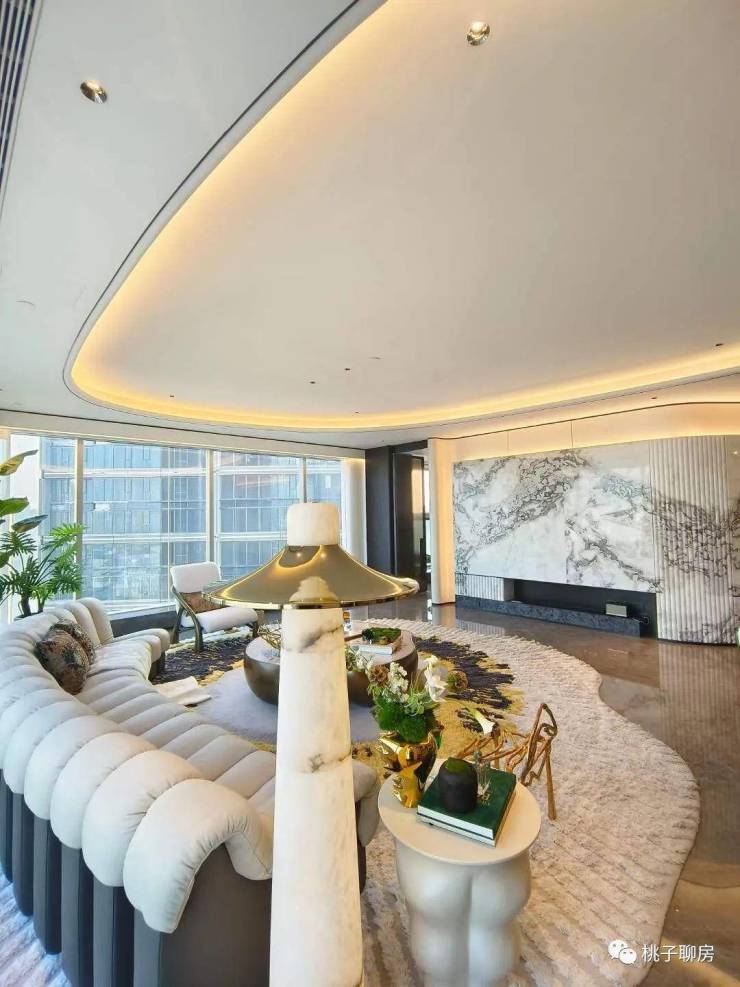 而李嘉诚御用设计师梁景华的390m²正厅,电视背景墙是意大利潘多拉奢石,甚至延伸到了空中花园,电动开启扇也是大平层中极为稀缺的,当窗户徐徐移下,正好就成了一道玻璃栏杆,变成开敞式空中花园。单单是这扇窗户,就快顶得上一辆特斯拉,而潮博奢侈的用了2辆。
