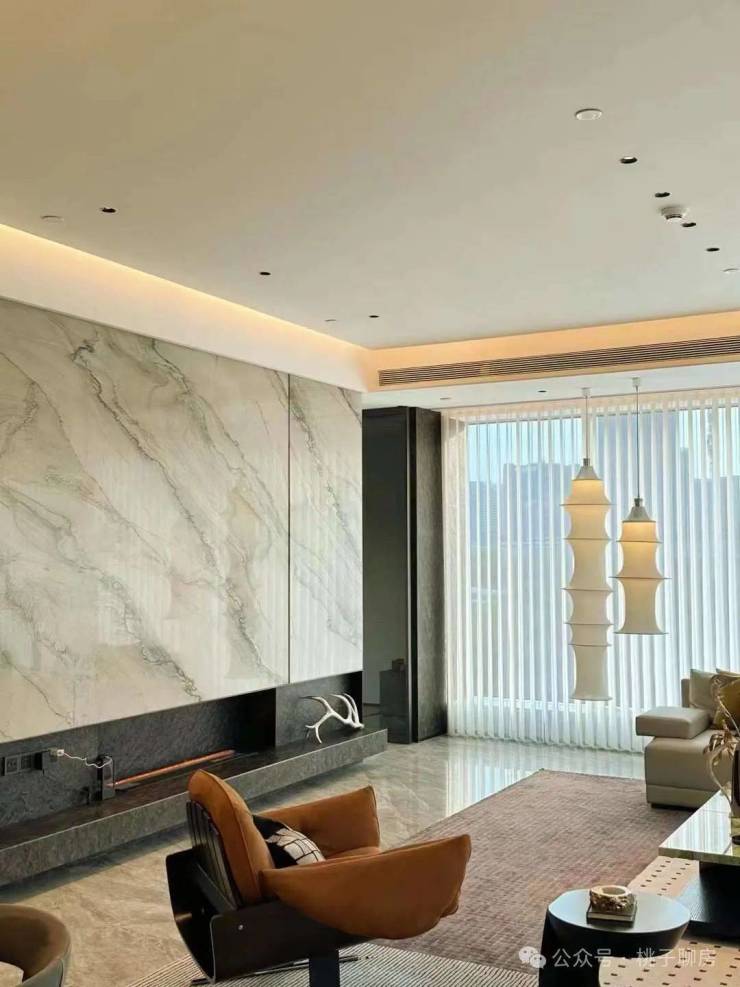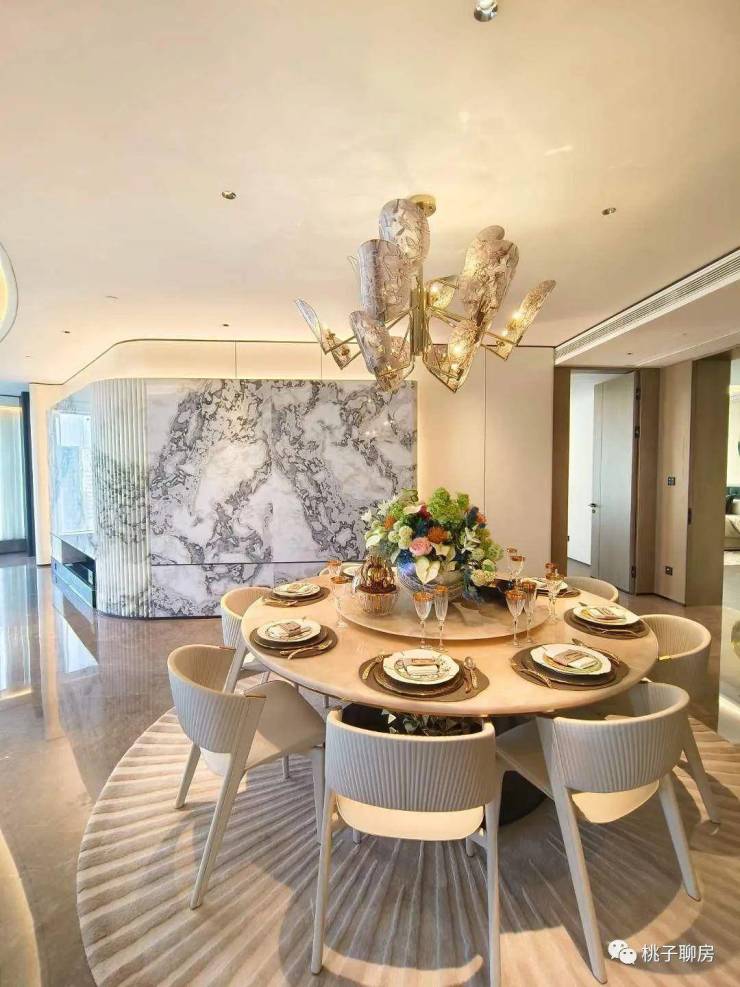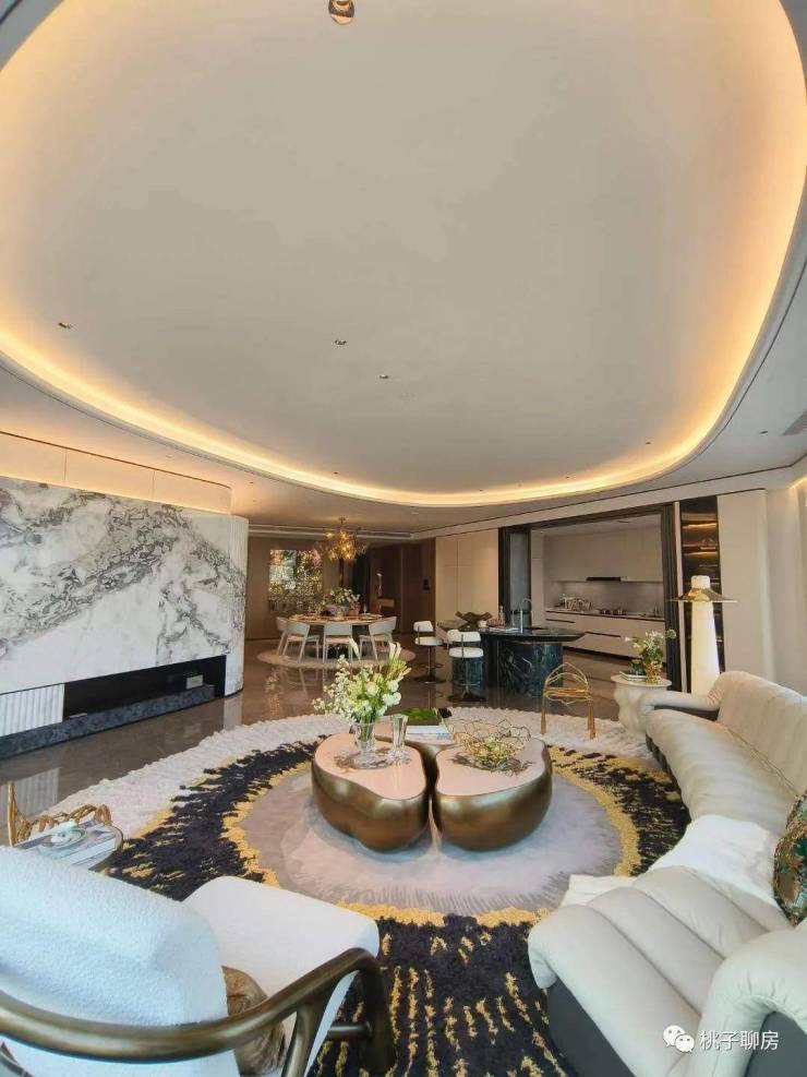 整体设计风格以浅白色为主,客厅背景墙贴着大面积「芬迪白大理石」,弧形的造型配合木饰面,以及酒店级的灯光设计,让整个空间看起来奢华又不失温馨。