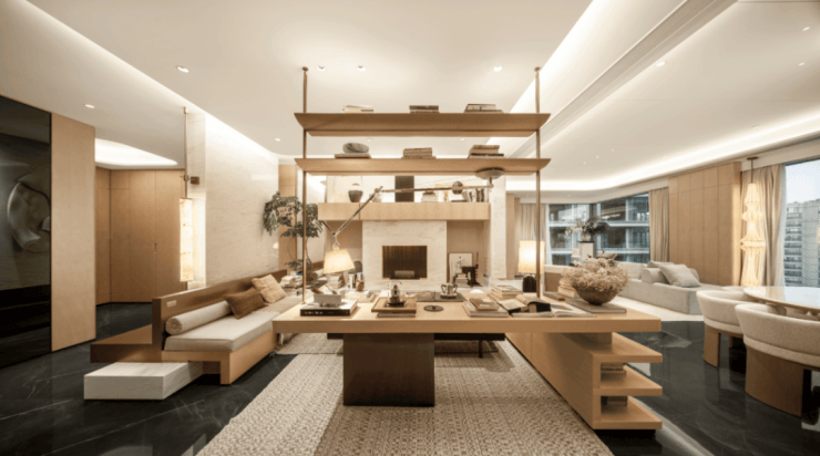 在绿城·凤咏朝阳,它被拆解为一系列可感知的细节: 约300+㎡的奢阔尺度 ,让空间不再是面积的堆砌,而是生活场景的自由舒展。国际大师团队执笔的东方美学, 将“摩登”与“东方”融于肌理 ——一石一木的纹理,是时间的笔触;金属与石材的收边,是匠心的温度。