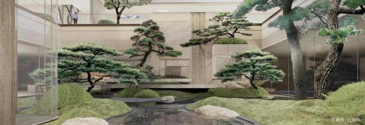 进门后,约3300方的中央景观,下沉式庭院、双水院景观依次呈现,将《松阁观潮图》、《溪山行旅图》、《山亭文会图》三幅宋代古画,演绎至松川境的立体山水之中。高层与排屋区之间,约210米的中轴景观贯穿东西,串联起「松川十一境」。