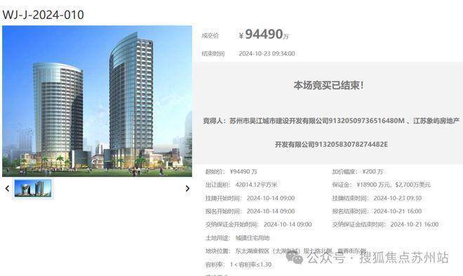 在2024年10月,该地块被吴江城建和象屿联合竞得。地块成交总价高达94490万元,成交楼面价为17300元/平方米,溢价率为0%